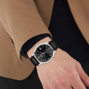 Hugo Boss 1513831 Commissioner Black Leather Quartz Men's Watch. Stainless steel case, leather strap, black dial. Tangue buckle clasp with mineral crystal glass. Case size 42 mm, water resistance upto 50 meters.