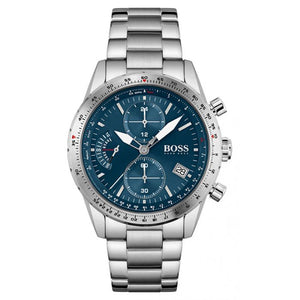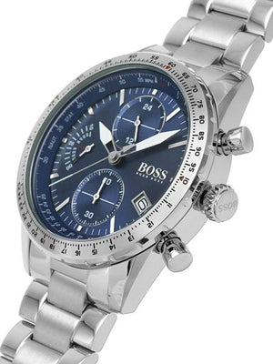 Aviation inspired, the Boss Men's Pilot Edition watch features a stainless steel casing with a blue chronograph dial and date functionality. The watch fastens with a stainless steel bracelet and also features a rotating bezel. Glass mineral crystal with push button deployment clasp. Case size 44mm, water resistance upto 50 meters.
