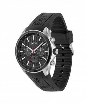 Hugo Boss Distinct Black Silicone Men's Chrono Watch - 1513855. Black dial with mineral crystal, case color silver, strap color black. Strap material silicone, stainless steel & ion plated black steel case material. Case size 46mm and water resistance upto 50 meters.