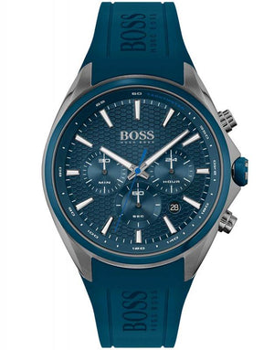 The Hugo Boss men's watch 1513856 is a real classic. The dial shows: 24-hour, chronograph, date, minute, second, hour. The high-quality bracelet made of silicone ensures a high wearing comfort. The water resistance in the amount of 5 atm, assures a good everyday suitability. A scratch-resistant hardened, mineral glass protects your new acquisition from accidental damage Case diameter: 46 mm. The colors of your new 1513856: Dial: Blue, Strap: Blue, Case: Grey. A watch for men who love the extraordinary from Hugo Boss.