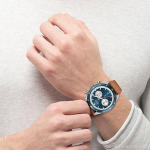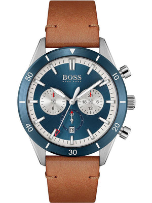 Sporty Hugo Boss Mens watch 1513860. Blue dial color, Strap color brown, case color silver. Very comfortable Calf leather strap. A scratch proove hardened, Mineral glass protects your watch from involuntary injuries. Case size 44mm and water resistance upto 50 meters.