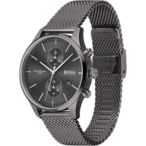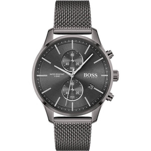 The Hugo Boss men's watch 1513870 is a real classic. The dial shows: chronograph, date, minute, second, hour. The high-quality stainless steel bracelet ensures a high wearing comfort. The water resistance in the amount of 5 atm, assures a good everyday suitability. A scratch-resistant hardened, mineral glass protects your new acquisition from accidental damage Case diameter: 42mm. The colours of your new 1513870: Dial: Grey, Strap: Grey, Case: Grey. A watch for men who love the extraordinary from Hugo Boss.