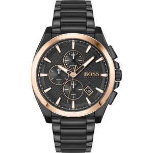 The Boss Mens Grandmaster Watch 1513885 combines a 46mm round shaped stainless steel case and a black stainless steel bracelet with a push button deployment clasp. It has a black chronograph display dial with luminescent hands and hour markers and a date window between four and five o-clock, which is protected beneath mineral crystal glass. Power is generated by the quartz movement. This model also has a water resistance of up to 50 meters.