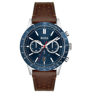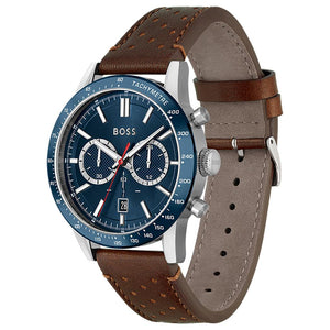 The BOSS Allure 1513921 is a stylish men's watch with a 44 mm stainless steel case. Blue leather strap with traditional buckle clasp. The clock features a stopwatch and a diary. The blue dial of the BOSS 1513921 watch is protected by mineral glass. The watch belongs to the water resistance class 50m / 5atm.