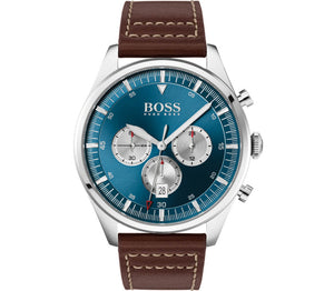 The perfect amalgamation of ruggedness and sophistication, this Boss Classic wrist watch tells more than just time. The grand blue dial features stick indexes, chronograph functionality, a date marker and quartz movement. The stainless steel case it attached to a brown genuine leather strap with cross stiches along the sides. Inside the case lies a movement and the watch features a mineral crystal. Case size 44mm. Water resistance upto 50 meters.