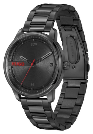 Featuring a vintage look with a modern twist, this HUGO Menswear watch has a clean black palette. Detailed with a logo and pops of red.