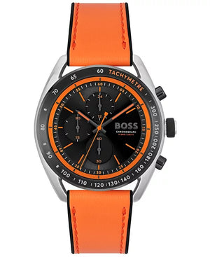 Hugo Boss Center Court chronograph quartz mens watch 1514025. Stainless steel case with leather and black silicone Strap, black dial. Quartz movement. Water resistance up to 100 meters. Mineral crystal. Case size 44mm. Buckle clasp.