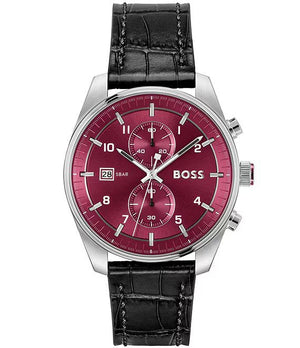 Boss Skytraveller chronograph quartz mens watch 1514193. Stainless steel case with black leather strap, green dial. Quartz movement. Water resistance up to 50 meters. Mineral crystal. Case diameter 44 mm. Buckle clasp.
