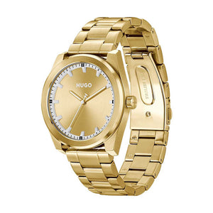 HUGO Men Bright Bracelet Style Analogue Watch 1530354. Gold-toned stainless steel case and bracelet with gold-toned dial. Quartz movement. Water resistance up to 50 meters. Case size 42mm. Deployment clasp with push buttons.