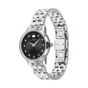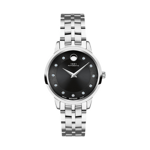 Movado 1881 Automatic, 30 mm stainless steel case and bracelet with black textured dial & 11 Diamond Markers. Caseback features an exposed automatic movement. Automatic watches do not contain batteries. They are charged by the movement of your wrist. If the watch is not worn it will stop running in about 44 hours. To get it started, turn the crown clockwise about 20-30 times until the second hand starts moving. You will most likely need to reset the time and date.