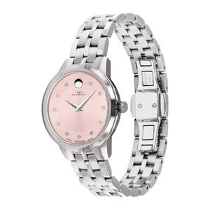 This women's 1881 Automatic watch from Movado is distinguished by a 30mm stainless steel case with an exhibition back, and a round bi-level pink soleil dial with a silver-tone signature dot, hands and diamond hour markers. The stainless steel bracelet has chevron-shaped links and secures with a push-button deployment clasp while a scratch-resistant sapphire crystal tops the case. The watch features a Swiss automatic movement, and is water-resistant to 30 meters.