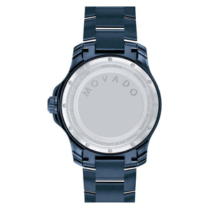 Mens movado active sport, 40 mm blue PVD case and bracelet, black dial featuring lumi hands and indexes, date window, sapphire crystal, swiss quartz movement. Water resistance up to 20 meters. Deployment clasp.