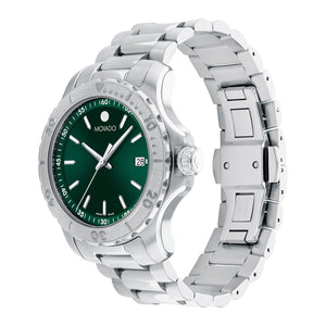 Mens movado active sport, 40 mm stainless steel case and bracelet, green dial with lumi hands and indexes, date window, sapphire crystal. Swiss quartz movement. Water resistance up to 200 meters. Deployment clasp with push button.