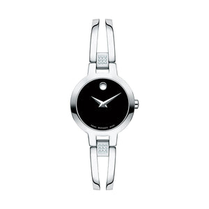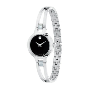 Womens amorosa watch, 24 mm stainless steel case, black museum dial with silver toned dot and hands, stainless steel double bar bangle style bracelet with 18 diamonds (0.070 t.c.w.), back sizing links and jewelry clasp. Quartz movement. Water resistance up to 30 meters. Scratch resistant sapphire crystal.