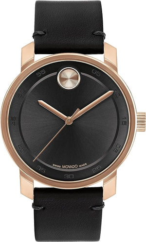 Movado bold access quartz men's watch 3600945. Stainless steel rose gold case with black leather strap, black dial. Quartz movement. Water resistance up to 100 meters. Case size 41mm. K1 mineral crystal. Pin buckle clasp.
