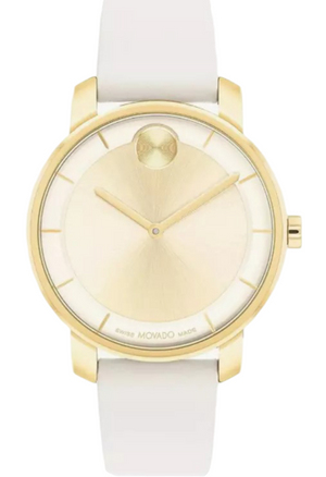 Simple, stylish and sophisticated, this ladies' Movado Bold Access watch with a gold dial complements all attire with ease. The subtle mixture of gold and white accentuates each individuals' personal look. The gold dial showcases gold toned hands and markers, and a signature dot at 12 o'clock. 34.0mm stainless steel case with mineral crystal. Swiss quartz movement keeps accurate time. The cream leather strap secures with a buckle clasp. Water resistant to 30 meters.