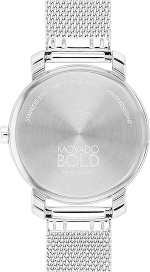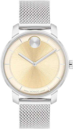 Movado bold Access quartz womens watch 3601070. Stainless steel case and mesh bracelet, gold Museum dial with flat dot. Quartz movement. Water resistance up to 100 meters. K1 mineral crystal. Deployment clasp with push button.