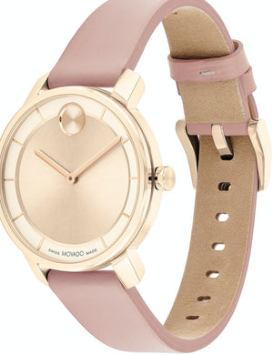 Movado bold access quartz womens watch 3601078. Rose gold ion plated stainless steel case with pink leather strap, rose gold dial. Quartz movement. Water resistance up to 30 meters. 34mm case size. Scratch resistant K1 mineral crystal. Pin buckle clasp.