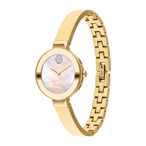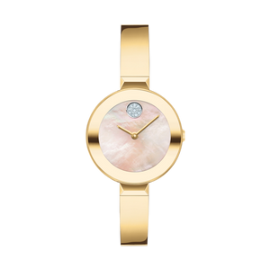 Light gold ion-plated stainless steel case and bracelet. Fixed light gold ion-plated bezel. Rose mother of pearl dial with pale yellow gold hands. No markers. Crystal-set Movado dot appears at the 12 o'clock position. Dial Type: Analog. Quartz movement. Scratch resistant K1 crystal. Pull / push crown. Solid case back. Round case shape. Case size: 28 mm. Case thickness: 7.5 mm. Band width: 8 mm. Jewelry clasp. Water resistant at 30 meters / 100 feet. Functions: hour, minute. Bold Series. Dress watch style. Watch label: Swiss Made. Movado Bold Yellow Gold Mother of Pearl Dial Ladies Watch 3600627.