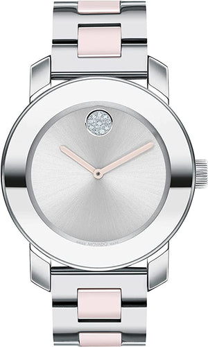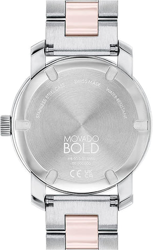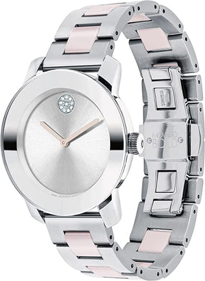 This Movado bold women's watch has a 36mm stainless steel bracelet with a contrasting blush ceramic centerlinks. Other features include a K1 crystal, a silver-tone dial with blush tone hands, and a white crystal dot. The gorgeous bracelet secures with a push button deployment clasp. Case size 36mm. Water resistant up to 30 meters. Quartz movement.