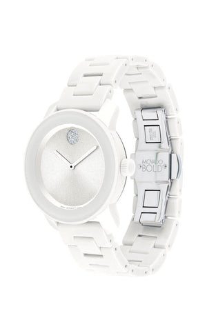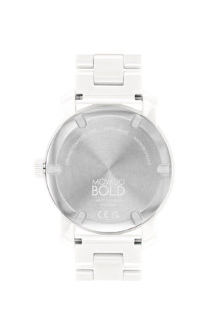 Movado bold ceramic, 36mm white ceramic case with a white toned dial on white ceramic link bracelet. Quartz movement. Case size 36mm. Water resistant up to 30 meters. K1 mineral crystal. Push Button Deployment Clasp.