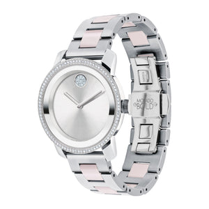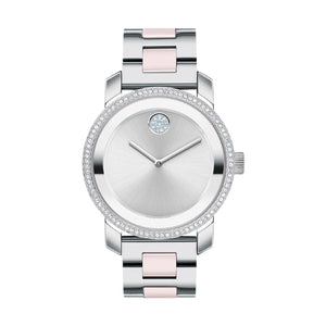 This cool, contemporary timepiece looks as good as it feels thanks to sleek ceramic accents. We’ve combined stainless steel with pretty blush pink ceramic center links and sparkling crystal details to create your new favorite watch. This Swiss made 36mm design features a silver tone dial and our iconic dot at 12 o’clock in crystals for a glam finish. Quartz movement. Case size 36mm. Water resistance up to 30 meters. Scratch resistant K1 mineral crystal. Deployment clasp with Push button release.