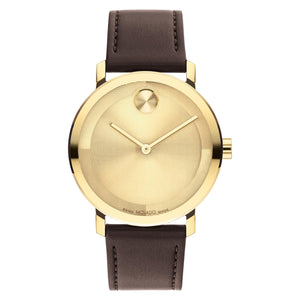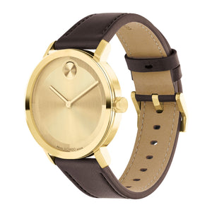 The evolution of modern design with a sharp look and elevated feel. Crafted from pale yellow goldtone ion-plated stainless steel, this sleek timepiece features a statement-making 40mm case that houses a captivating micro-textured goldtone dial with a glossy lacquer overlay, slim hands, and our iconic dot motif at 12 o’clock. A luxurious chocolate brown leather strap with a buckle closure completes the design. Quartz movement. Water resistance up to 30 meters. K1 mineral crystal. Pin buckle claps.