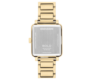The BOLD Evolution 2.0 is defined by an elevated, bold case and a dimensional micro-textured dial. This 26mm square watch features a white lacquer dial, slim light yellow gold tone hands, and our signature dot at 12 o'clock. Water resistance up to 30 meters. K1 mineral crystal. Deployment clasp with push button.