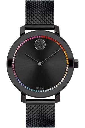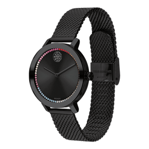 Black ion-plated stainless steel case with a black ion-plated stainless steel mesh bracelet. Fixed black ion-plated bezel. Black (rainbow crystals) dial with black hands. No markers. The Movado dot appears at the 12 o'clock position. Dial Type: Analog. Quartz movement. Scratch resistant K1 mineral crystal. Pull / push crown. Solid case back. Round case shape. Case size: 34 mm. Fold over slip through clasp. Water resistant at 30 meters / 100 feet. Functions: hour, minute. Bold Evolution Series. Dress watch style. Watch label: Swiss Made. Movado BOLD Evolution Quartz Black Dial Ladies Watch 3600714.