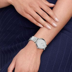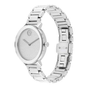 A silver-tone monochromatic design gives this women's Movado BOLD Evolution watch both edge and style. The watch features a thin 34mm ion-plated stainless steel case, K1 crystal, and silver glitter dial with brilliantly contrasting crystal sunray dot and hands. The ion-plated stainless steel bracelet secures with a push-button deployment clasp. The watch is water resistant to 30 meters