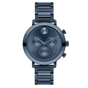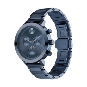 Movado BOLD Evolution, 38mm blue ion-plated stainless steel case featuring a blue sunray chronograph dial, edge to edge crystal and date window detailing on a blue ion-plated stainless steel bracelet. Scratch resistacne K1 mineral crystal. Water resistance upto 30 meters.