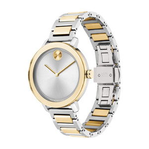 Movado bold evolution 34mm. Two tone stainless steel and pale yellow gold ion plated stainless steel case and bracelet with a silver toned dial. Quartz movement. Case size 34mm. Water resistant up to 30 meters. K1 mineral crystal. Push button deployment clasp.