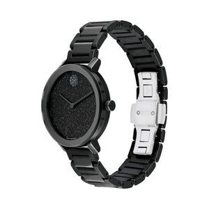 Movado bold evolution, 34mm black ion plated stainless steel case and bracelet with black glitter dial and crystal pave dot. Quartz movement. Case size 34mm. Water resistantup to 30 meters. K1 mineral crystal. Push button deployment clasp.