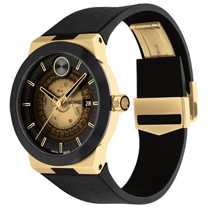Sporty style with contemporary-cool edge, powered by the motion of your wrist. This BOLD Fusion watch features a self-winding movement that draws its power from the movement of your arm, no batteries required. It makes an ultra-modern statement with its yellow gold ion-plated stainless steel 44mm case, a black ceramic bezel, and a captivating exhibition dial that reveals the beauty of its automatic movement. The dial boasts a black hour track with yellow gold toned details, Swiss SuperLumiNova® accents, and a date window. We’ve completed the design with a super sleek black silicone strap with a black alcantara inlay. Water resistance up to 50 meters.