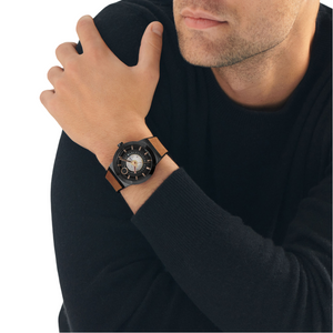 The BOLD Fusion Automatic is defined by a bold, sporty case and a modern edge. A Swiss made automatic movement drives this watch, powered by the motion of your wrist. This 44mm watch features a black exhibition dial with a rose goldtone centerzone, Swiss Super-LumiNova accents, and an exhibition case back. Automatic watches do not contain batteries. They are charged by the movement of your wrist. If the watch is not worn it will stop running in about 38 hours. To get it started, turn the crown clockwise about 20-30 times until the second-hand starts moving. You will most likely need to reset the time and date. Grey ion-plated stainless steel case with black, grey ruber strap, dark grey dial. Automatic movement Water resistance up to 50 meters. Sapphire crystal. Fold over clasp with push button.