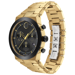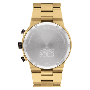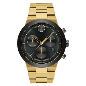 Movado BOLD Fusion, 44.5mm pale yellow gold ion-plated stainless steel case and bracelet with a black and pale yellow gold accented chronograph dial and ceramic bezel. Quartz movement, K1 crystal. Water resistance upto 30 meters.
