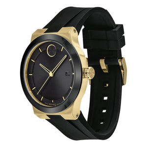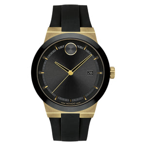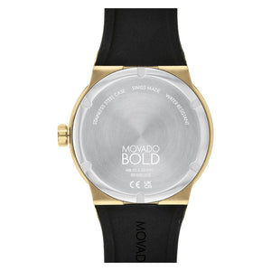 Movado bold fusion 42mm. Pale yellow gold ion plated stainless steel case and black ceramic bezel with a black toned dial on black silicone strap. Quartz movement. Case size 42mm. Water resistant up to 50 meters. K1 mineral crystal. Buckle clasp.