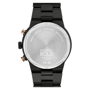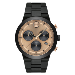 Sporty style with contemporary-cool edge. This BOLD Fusion chronograph features a black ion-plated stainless steel 44mm case and a matching link bracelet for a sleek, minimalist effect. Its bronze toned dial is framed by a black ceramic bezel and boasts our iconic dot motif at 12:00, a date window, three sub dials and a minute track, all accented in rich black. Water resistance up to 50 meters.