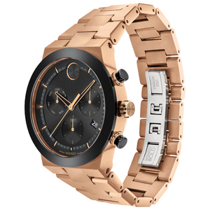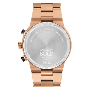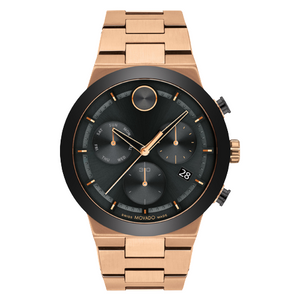 Sporty style with contemporary-cool edge. This BOLD Fusion chronograph features a bronze ion-plated stainless steel 44mm case and a matching link bracelet for a sleek, minimalist effect. Its rich black dial is framed by a matching ceramic bezel and boasts our iconic dot motif at 12:00, a date window, three sub dials and a minute track with bronze toned accents. Water resistance up to 50 meters.