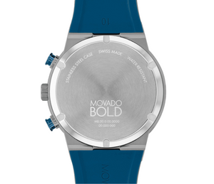 The BOLD Fusion Chronograph brings a bold, sporty case to retro-futurist design. This 44mm chronograph watch features a blue dial, military grey subdials, and Swiss Super-LumiNova® accents. Water resistance up to 50 meters. K1 mineral crystal. Pin buckle clasp.