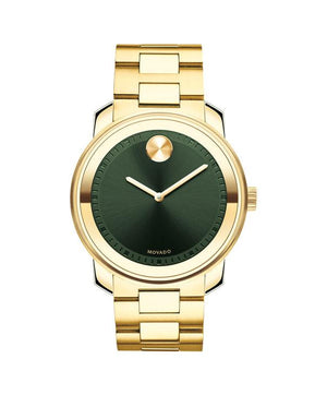 Gold-tone stainless steel case with a gold-tone stainless steel bracelet. Fixed gold-tone stainless steel bezel. Green dial with gold-tone hands and iconic museum dot. Dial Type: Analog. Quartz movement. Scratch resistant k1 crystal. Pull / push crown. Solid case back. Round case shape. Case size: 43 mm. Buckle clasp. Water resistant at 30 meters / 100 feet.