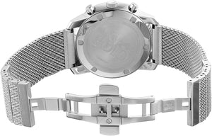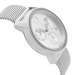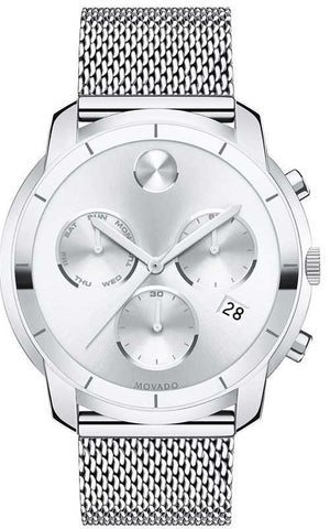 Movado Bold Watch . Quartz chronograph movement with hour and minute hands. Central chronograph hand and date window at 4 o`clock position. Small seconds counter at 3 o`clock position, 30 minute counter at 6 o`clock position and calendar display at 9 o`clock position. Silver dial with index hour markers. Stainless steel bezel set on a 44mm steel case. Mineral crystal and solid case back. Water resistant to 30M. Stainless steel mesh style bracelet.