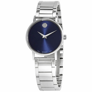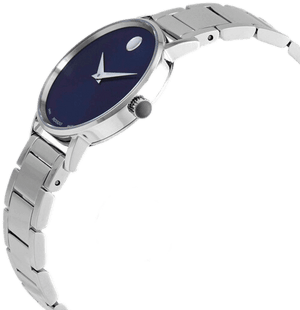 Stainless steel case with a stainless steel bracelet. Fixed stainless steel bezel. Blue dial with silver-tone hands. No markers. The Movado dot appears at the 12 o'clock positions. Dial Type: Analog. Quartz movement. Scratch resistant K1 mineral crystal. Pull / push crown. Solid case back. Round case shape. Case size: 38 mm. Fold over clasp. Water resistant at 30 meters / 100 feet. Bold Series. Casual watch style. Watch label: Swiss Made. Movado Bold Quartz Blue Dial Men's Watch 0607235.