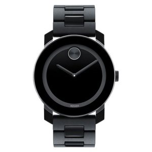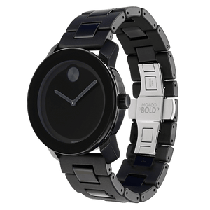 Black TR90 composite material case with a TR90 composite material bracelet. Black TR90 composite bezel. Black dial with black hands. No markers. The signature Movado dot appears at the 12 o'clock position. Dial Type: Analog. Quartz movement. Scratch resistant mineral crystal. Solid case back. Case diameter: 42 mm. Round case shape. Deployment clasp. Water resistant at 30 meters/ 100 feet. Functions: hours, minutes. Casual watch style. Watch label: Swiss Made. Movado Bold 42 mm Movado Bold 42 mm Large Black Dial Black TR90 Composite Men's Watch 3600047