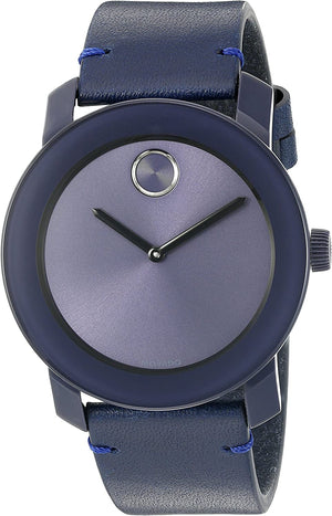 Stainless steel case with a blue leather strap. Fixed stainless steel bezel. Blue dial. Minute markers around the outer rim. The Movado dot appears at the 12 o'clock position. Dial type analog. Swiss quartz movement. Scratch resistant K1 mineral crystal. Solid case back. Case size 42 mm. Round case shape. Tang clasp. Water resistant at 30 meters 100 feet. Casual watch style. Movado bold blue dial blue leather Mens Watch 3600370.