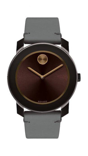 Brown TR90 composite case with a grey (bull hide) leather strap. Fixed Black-plated stainless steel bezel. Brown sunray dial with Rose Gold hands. A Movado dot marks the 12 o'clock position. Dial Type: Analog. Quartz movement. Scratch resistant K1 crystal. Pull / push crown. Solid case back. Case size: 42 mm, case thickness: 11 mm. Round case shape. Band width: 22 mm. Tang clasp. Water resistant at 30 meters / 100 feet. Functions: hour, minute. Additional Info: in general, withstands splashes or brief immersion in water, but not suitable for swimming. Dress watch style. Watch label: Swiss Movt. Movado Bold Brown Sunray Dial Grey Leather Men's Watch 3600455.