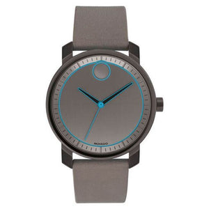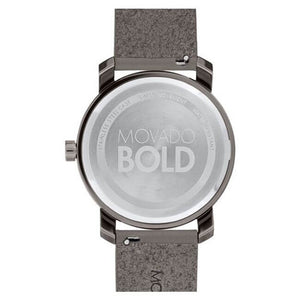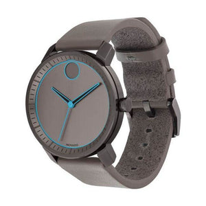 Grey ion-plated stainless steel case with a grey leather strap. Fixed grey ion-plated bezel. Grey dial with glossy blue hands and index hour markers. Minute markers around the outer rim. The Movado dot appears at the 12 o'clock position. Dial Type: Analog. Quartz movement. Scratch resistant K1 mineral crystal. Pull / push crown. Solid case back. Round case shape. Case size: 41 mm. Tang clasp. Water resistant at 50 meters / 165 feet. Functions: hour, minute, second. Casual watch style. Movado Bold Grey Dial Men's Watch 3600490.