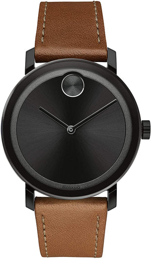 Black ion-plated stainless steel case with a cognac leather strap. Fixed black ion-plated bezel. Black sunray dial with black hands. No markers. The Movado dot appears at the 12 o'clock position. Dial Type: Analog. Quartz movement. Scratch resistant k1 mineral crystal. Pull / push crown. Solid case back. Round case shape. Case size: 40 mm. Case thickness: 8.75 mm. Band width: 21 mm. Tang clasp. Water resistant at 30 meters / 100 feet. Functions: hour, minute. Dress watch style. Watch label: Swiss Movt. Movado Bold Black Sunray Dial Cognac Leather Men's Watch 3600537.