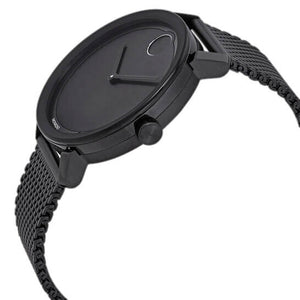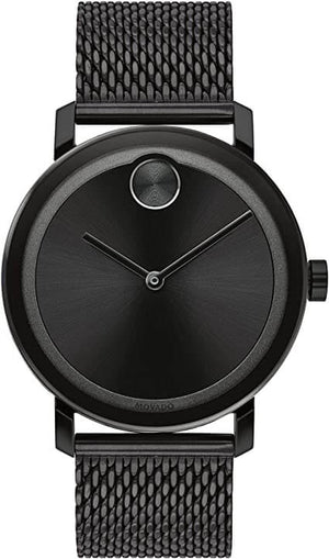 Black ion-plated stainless steel case with a black ion-plated stainless steel mesh bracelet. Fixed black ion-plated bezel. Black dial with black hands. No markers. The Movado dot appears at the 12 o'clock position. Dial Type: Analog. Quartz movement. Scratch resistant K1 crystal. Pull / push crown. Solid case back. Round case shape. Case size: 40 mm. Band width: 20 mm. Fold over slip through clasp. Water resistant at 30 meters / 100 feet. Functions: hour, minute. Bold Series. Casual watch style. Watch label: Swiss Movt. Movado Bold Black Dial Black Ion-plated MeshMens Watch 3600562.
