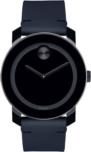 Black ion-plated stainless steel case with a dark navy leather strap. Fixed stainless steel bezel with a black tr90 composite ring. Black museum dial with black hands. No markers. The Movado dot appears at the 12 o'clock position. Dial Type: Analog. Quartz movement. Scratch resistant K1 mineral crystal. Pull / push crown. Solid case back. Round case shape. Case size: 42 mm. Band width: 20 mm. Tang clasp. Water resistant at 30 meters / 100 feet. Functions: hour, minute. Bold Series. Casual watch style. Watch label: Swiss Made. Movado Bold Quartz Black Museum Dial Men's Watch 3600583.